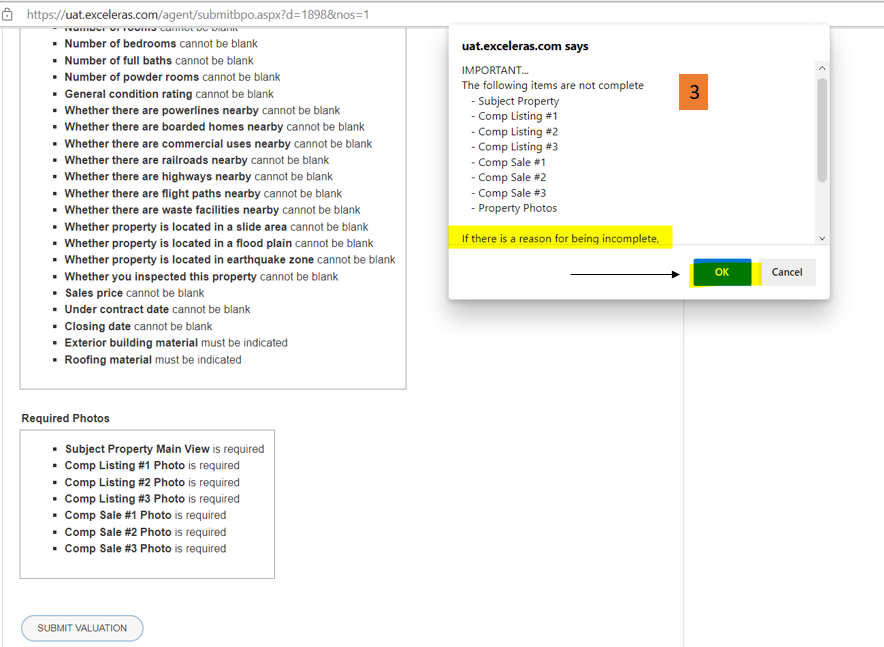 - If you choose to complete the BPO with missing fields, when you click “Submit Valuation,” a dialog box will appear advising of missing fields (3). You can click on “OK” to route the BPO to the Client or “Cancel” to go back and complete the missing fields.